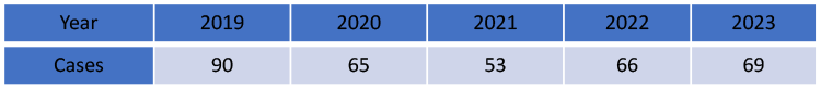 In total there were 343 trigger finger releases performed from 2019-2023. The digits are labeled Left (L) or Right (R), and 1-5 corresponding to the thumb (1), index (2), long (3), ring (4), and little (5) fingers. The right R1 and R3 were most affected at 61 and 64 affected digits respectively. Left L1 and L3 were close behind at 46 and 57 respectively. Interestingly, L2, L5, R2, and R5 were significantly less affected at 7, 5, 15, and 11.